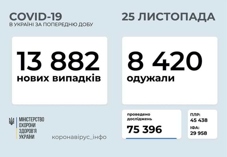 13 882 нових випадки коронавірусної хвороби COVID-19 зафіксовано в Україні станом на 25 листопада 2020 року