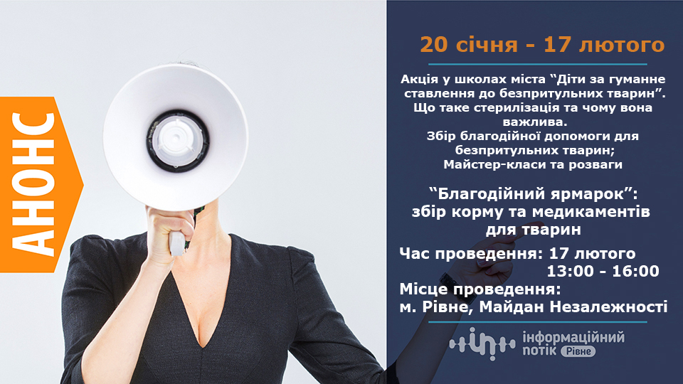 Крім того, 17 лютого з 13:00 до 16:00 на майдані Незалежності, у Рівному, відбудеться проведення акції “Благодійний ярмарок”, під час якої проводитиметься збір корму та медикаментів для тварин.
