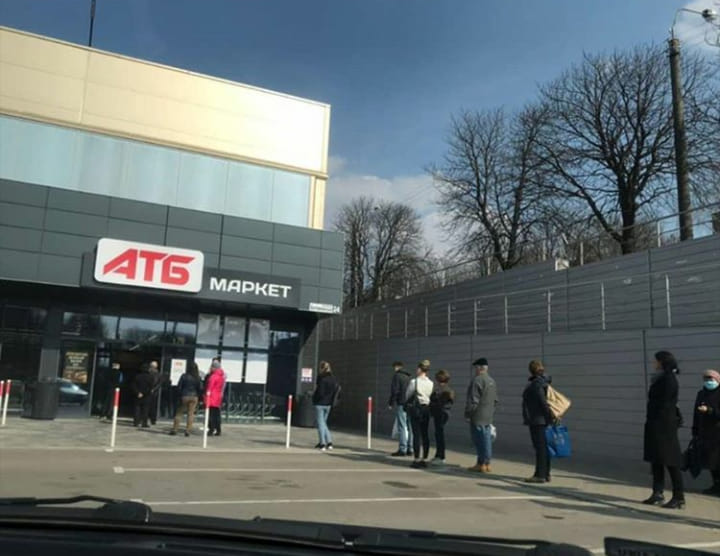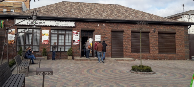 Яскраве оголошення на дверях попереджає, що в цьому магазині одночасно може перебувати не більше 5 покупців (у більших — 10). Тож люди стають перед входом у чергу, зберігаючи відстань. Черга, щоправда, рухається швидко — покупці стараються не затримуватись у торговому залі.
