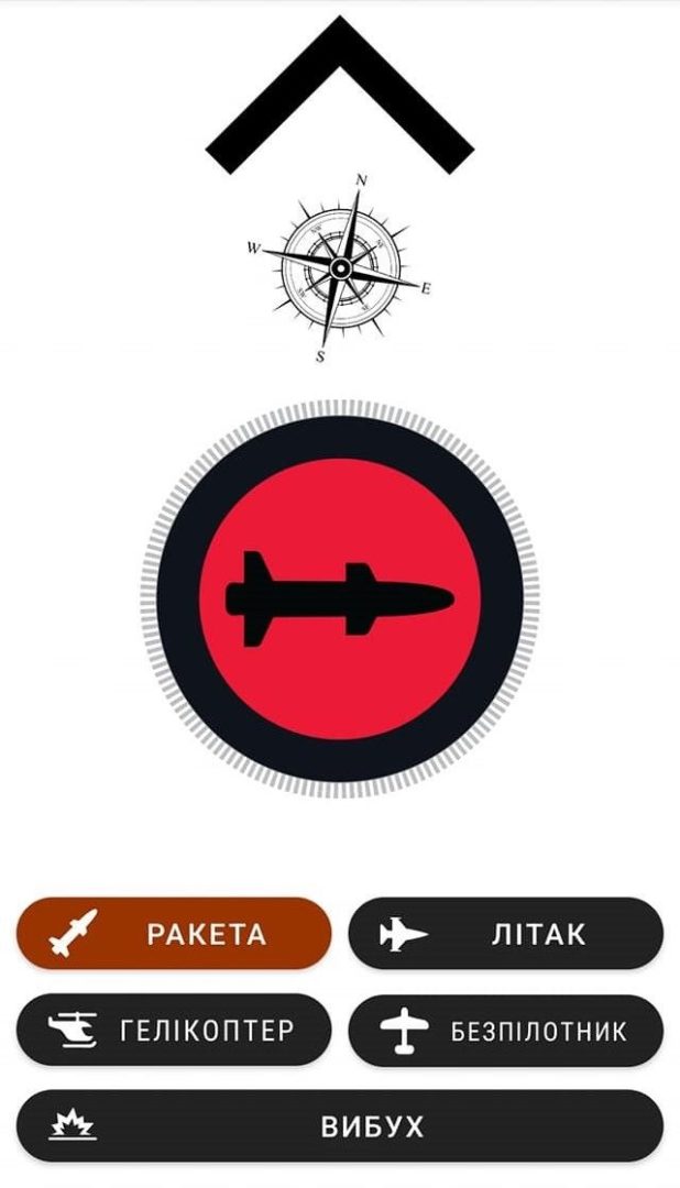 Коли ж ви побачите повітряну ціль, як-от ракету чи дрон-камікадзе, у додатку треба вибрати тип повітряної цілі, направити смартфон у напрямку руху цієї цілі та натиснути велику червону кнопку. Фахівці ППО побачать відмітку на мапі і вона доповнить радіолокаційну інформацію.