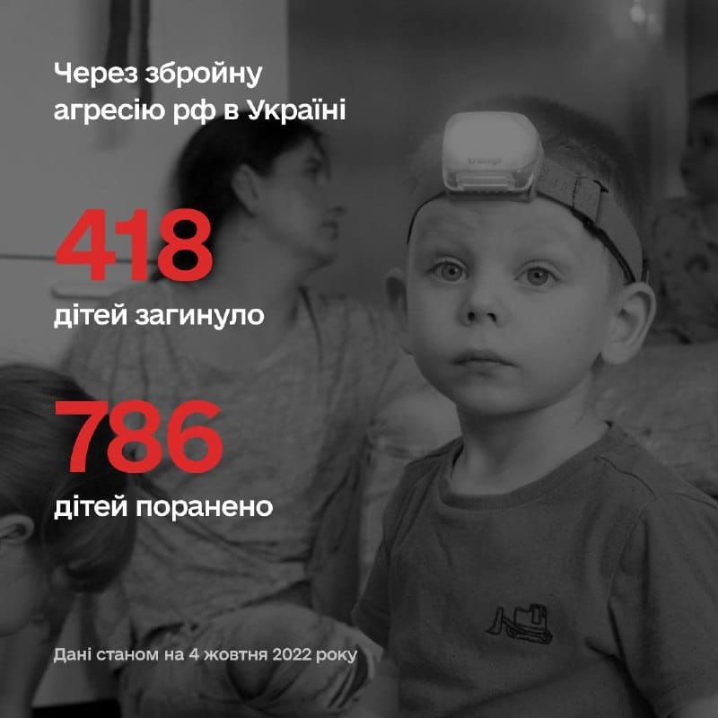 Станом на ранок 4 жовтня 2022 року більш ніж 1204 дитини постраждали в Україні внаслідок повномасштабної збройної агресії рф. 418 дітей загинуло та понад 786 отримали поранення різного ступеню тяжкості.