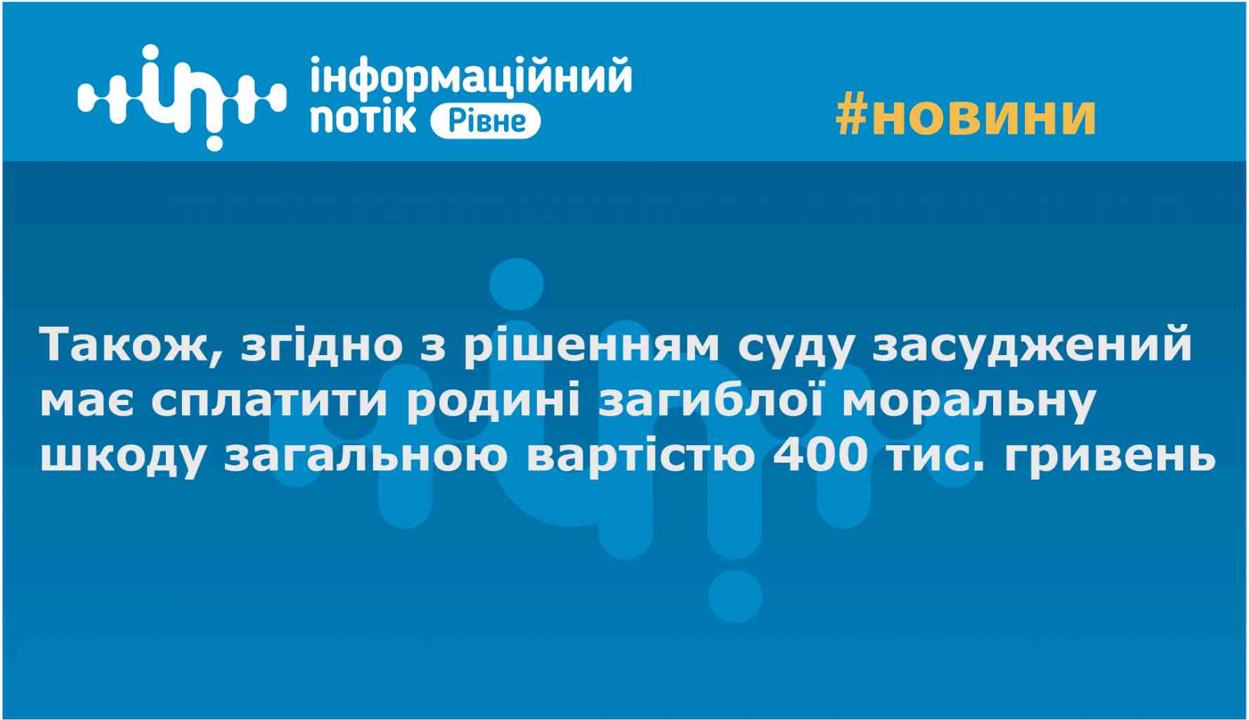 За активної позиції прокуратури Рівненської області Волинським апеляційним судом 25.03.2019 ухвалено рішення, відповідно до якого залишено без змін вирок Костопільського районного суду від 15.02.2018, яким 48-річного мешканця області засуджено до 8 років позбавлення волі за вчинення кримінального правопорушення, передбаченого ч. 1 ст. 115 КК України (умисне вбивство). Також, згідно з рішенням суду засуджений має сплатити родині загиблої моральну шкоду загальною вартістю 400 тис. гривень.