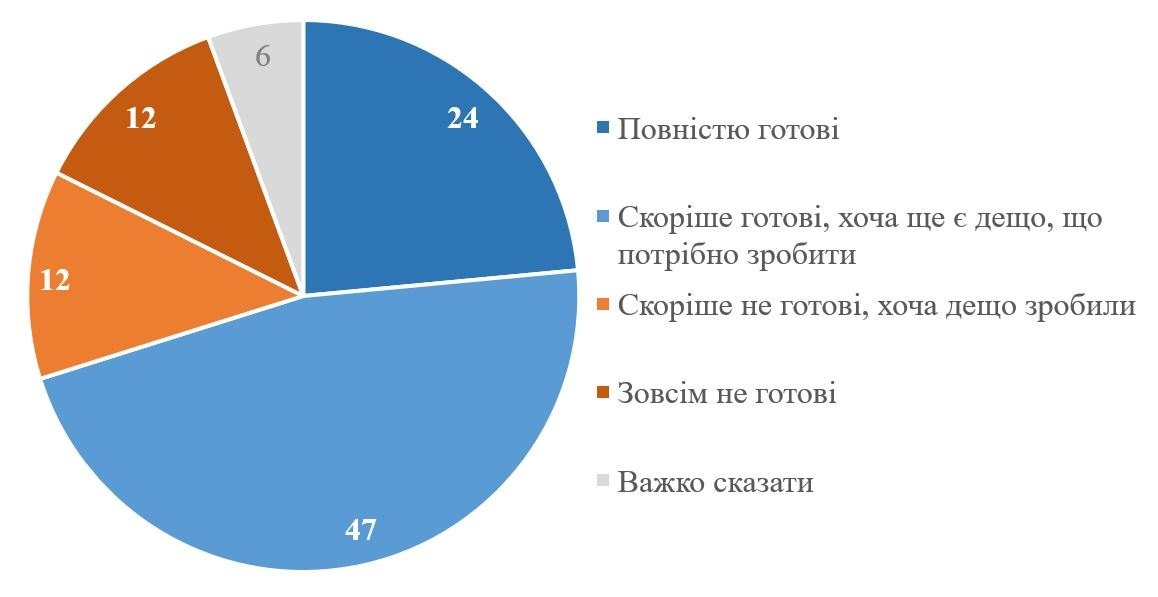 Більшість респондентів (70%) відповіли, що їхня оселя скоріше або повністю готова до можливих проблем з опаленням. Із них лише 24% вважають себе повністю готовими, у той час як 47% вважають себе скоріше готовими і стверджують, що «ще є дещо, що потрібно зробити для підготовки». Не вважають себе готовими 24% українців, із них 12% зовсім не готові.