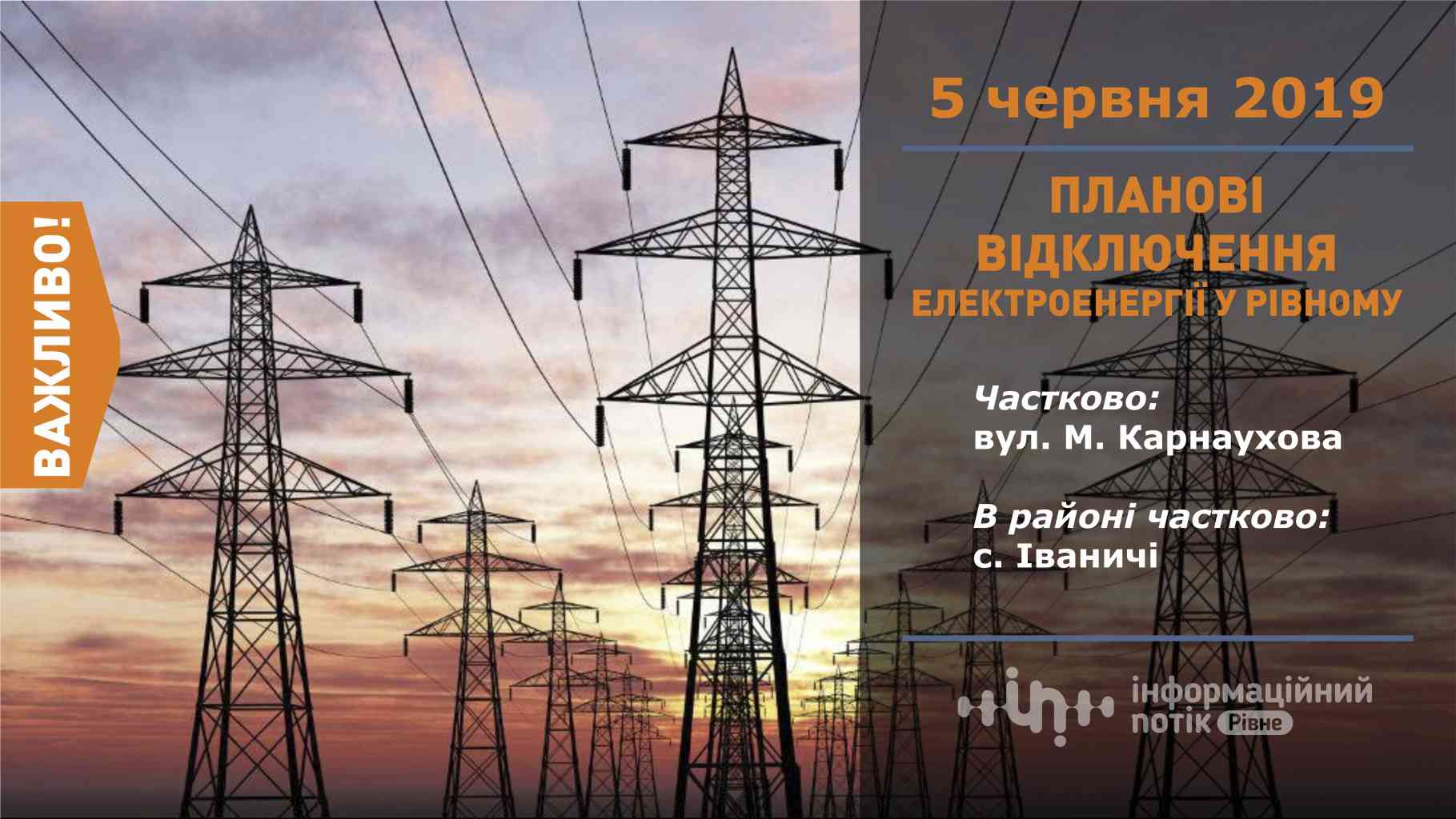 5 червня з 09:00 до 17:00 буде відсутня електроенергія в м. Рівне частково: вул. М. Карнаухова.
