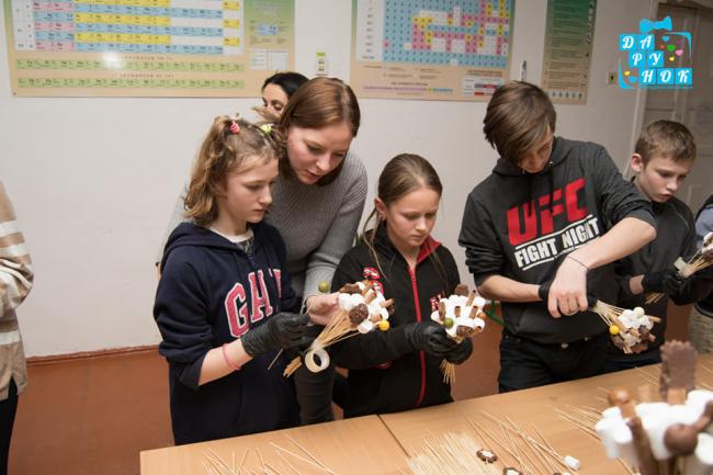 У нашій уяві це мали бути старші дівчатка, яким потрібно буде пояснювати все до дрібних деталей. Яким було наше здивування, коли на майстре класі було ще й кілька хлопців, які самі захотіли навчитись робити букети. Діти реально хотіли вчитись і вже мали невеличке уявлення про спосіб роботи. До речі, на нашу пропозицію з’їсти всі солодощі і нічого не робити, хором сказали – ніі. Ірина Борболь впоралась з 14 дітьми».