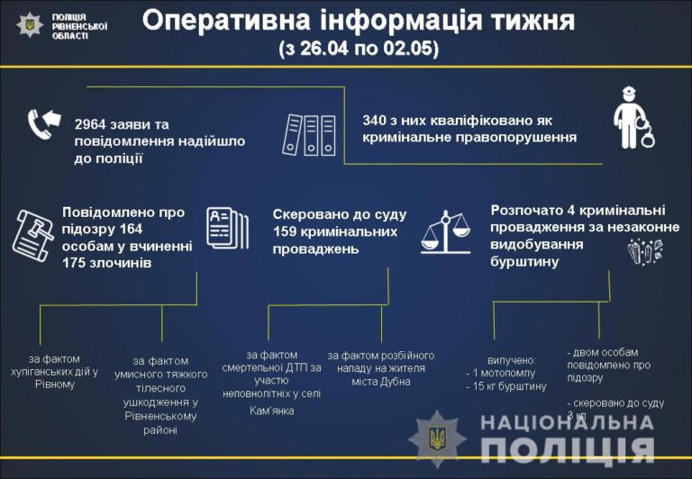 За минулий тиждень з 26 квітня по 2 травня на Рівненщині до органів поліції надійшло 2964 заяв та повідомлень.