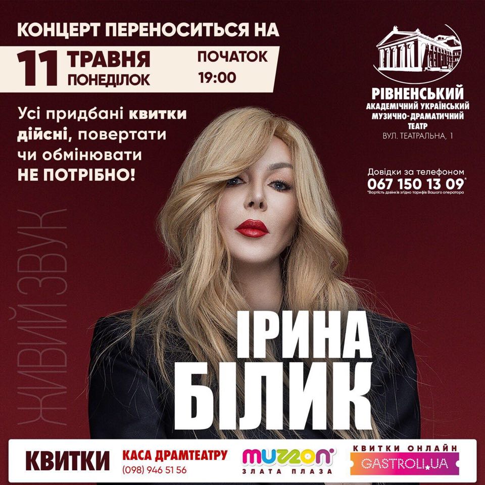 Друзі, у зв‘язку із останніми подіями в країні та світі, за для запобігання поширенню коронавіруса COVID-19 ми переносимо наші заходи. Ірина Білик приїде до Рівного зі своїм ювілейним концертом 24 травня.