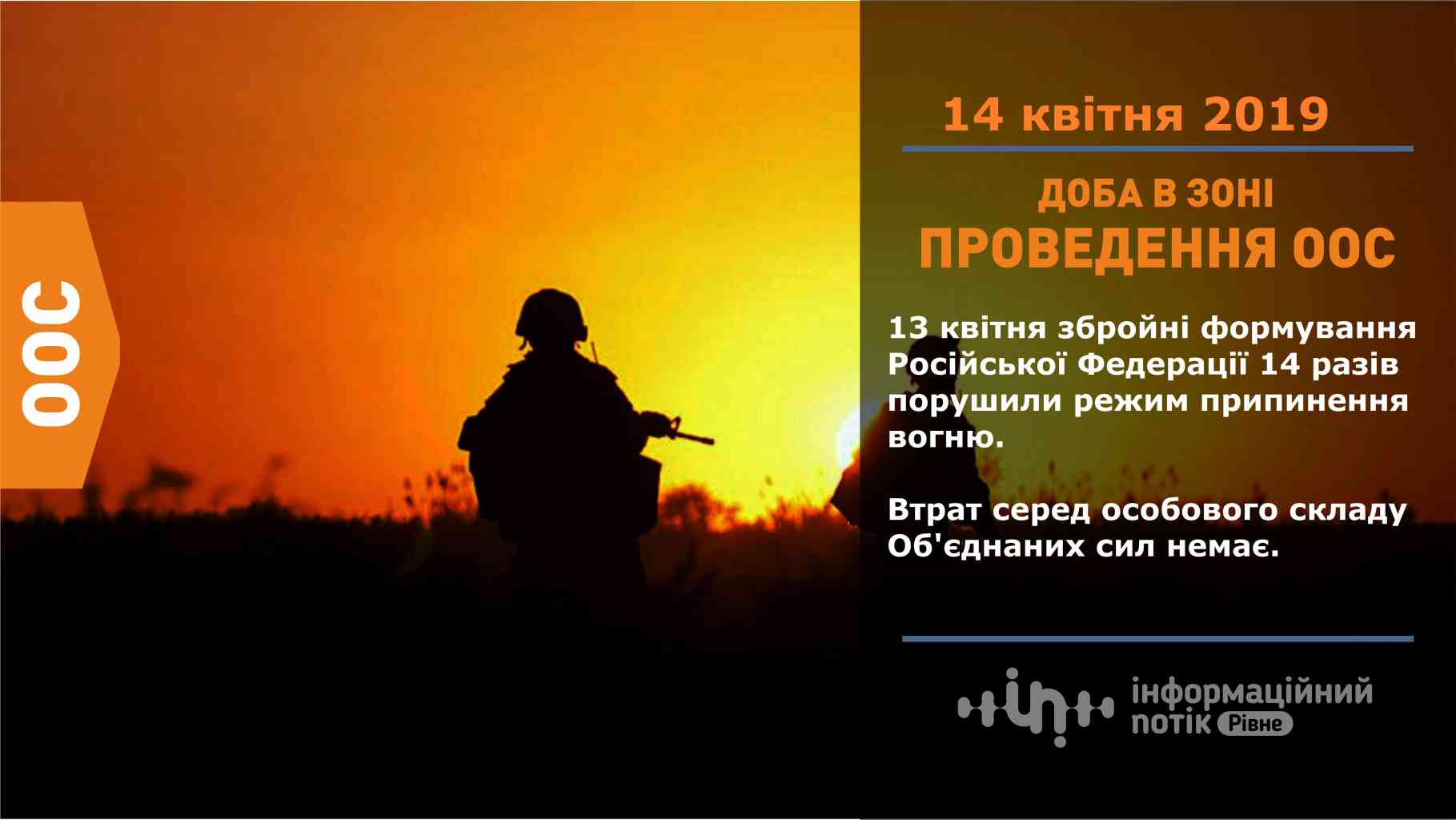 13 квітня збройні формування Російської Федерації 14 разів порушили режим припинення вогню. Ворог обстрілював наших захисників з протитанкових ракетних комплексів, гранатометів різних систем, великокаліберних кулеметів та стрілецької зброї, крім цього чотири рази застосував заборонене Мінськими домовленостями озброєння (міномети калібру 120 мм – 2 рази, міномети калібру 82 мм – 2 рази).