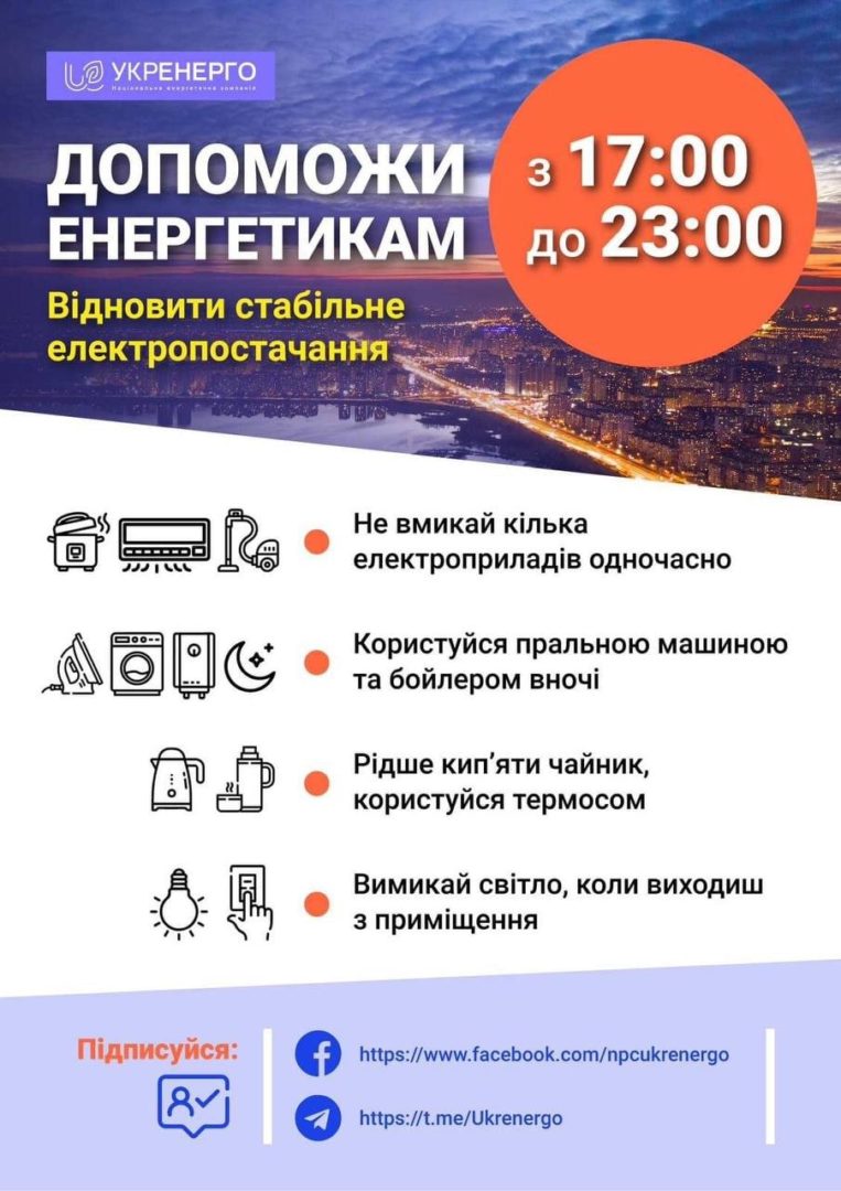 Сьогодні від 17:00 до 23:00 потрібно обмежити споживання електроенергії.