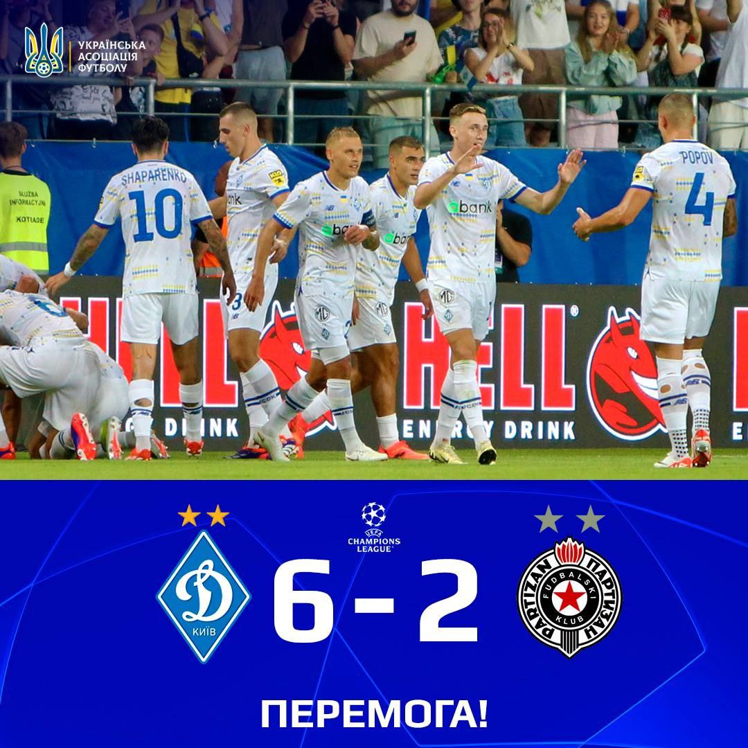 «Динамо» перемагає сербський «Партизан» з рахунком 6:2 в першому матчі відбору Ліги чемпіонів.