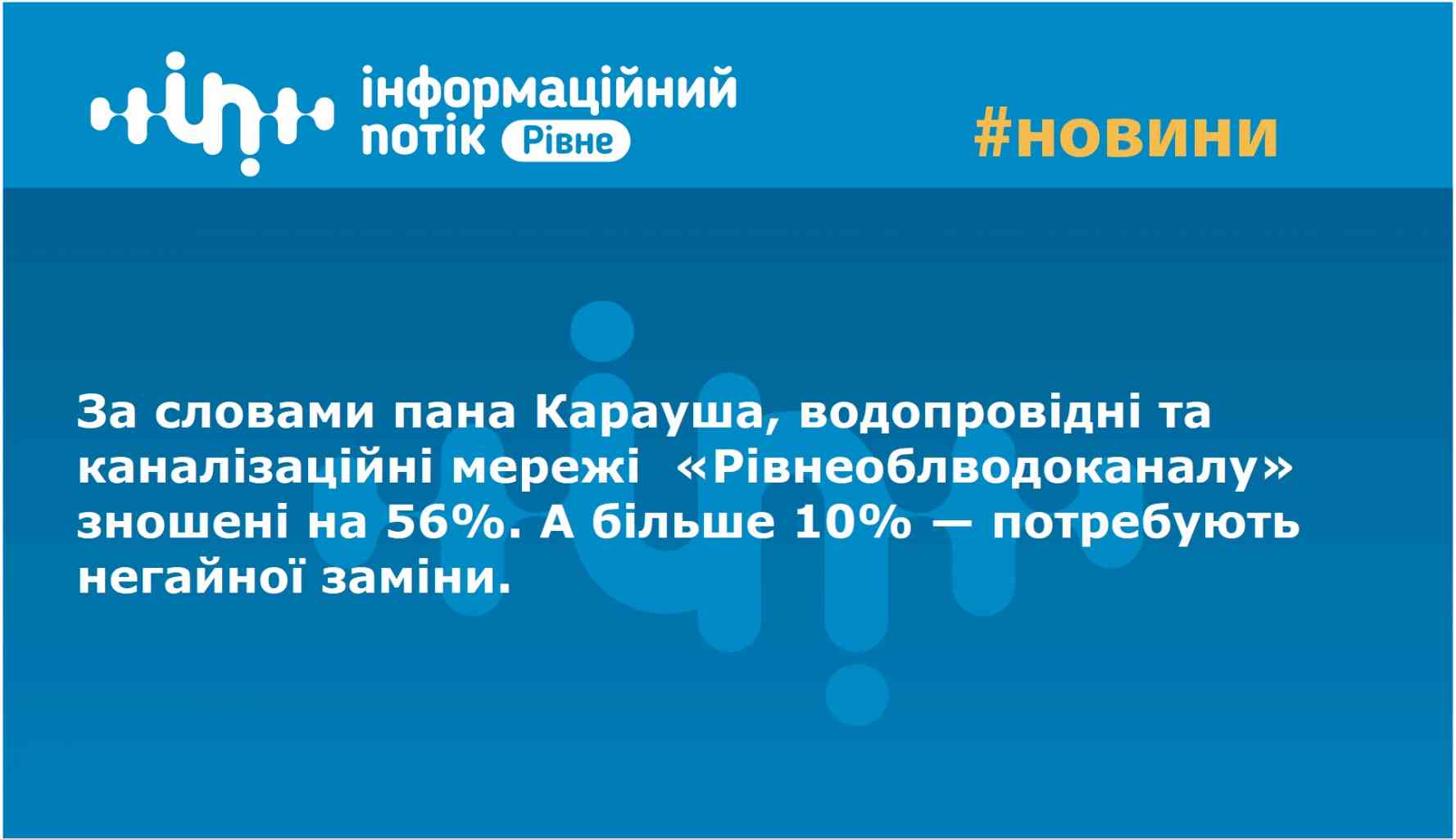 За словами пана Карауша, водопровідні та каналізаційні мережі «Рівнеоблводоканалу» зношені на 56%. А більше 10% — потребують негайної заміни. Матеріали, які використовувалися для прокладання цих мереж — сталь і залізобетон, що мають значно менший термін експлуатації, ніж сучасні поліетиленові труби.