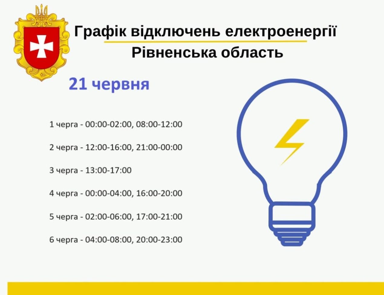 Графік погодинних відключень електроенергії на Рівненщині у п’ятницю, 21 червня: