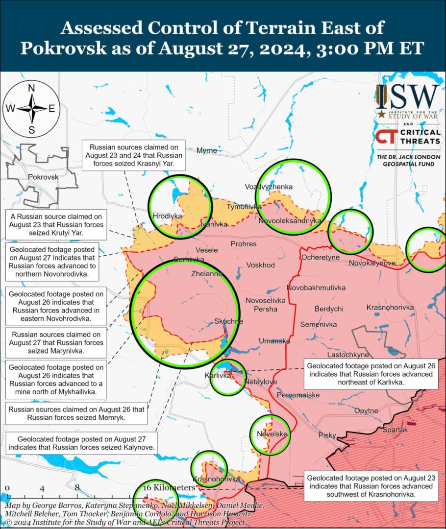 Опубліковані 27 серпня геолокаційні кадри підтверджують, що окупанти просунулись на понад 2 км до північно-західної Новогродівки, вздовж вулиці Дубініна, і утримують позиції в центральній частині міста.