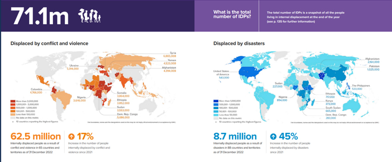 За даними організації, майже три чверті переміщених осіб проживають у 10 країнах – Сирії, Афганістані, Демократичній Республіці Конго (ДРК), Україні, Колумбії, Ефіопії, Ємені, Нігерії, Сомалі та Судані.