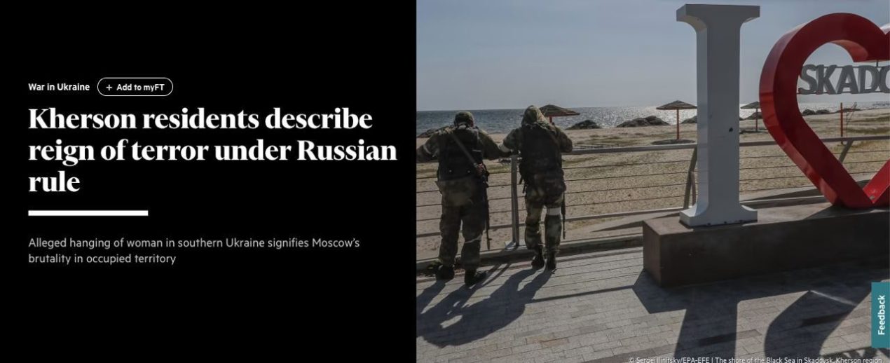 На Херсонщині повісили жінку біля будівлі суду через її слова, що Скадовськ – це Україна, повідомляє Financial Times.