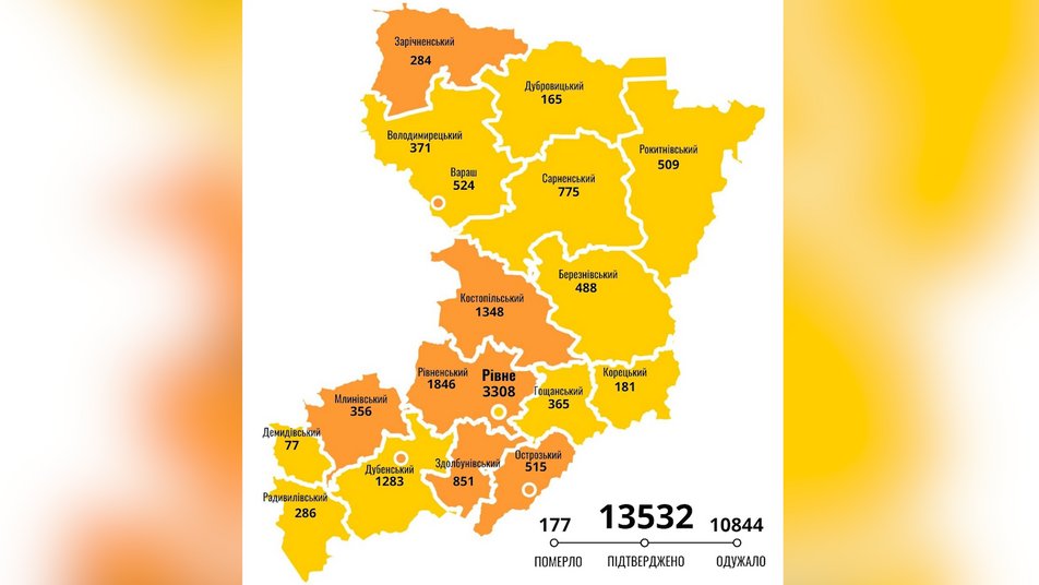 З початку пандемії у Рівненській області лабораторно підтвердили 13532 випадки захворювання на коронавірус. Зареєстровано 177 смертей від ускладнень (1,3%), спричинених COVID-19.