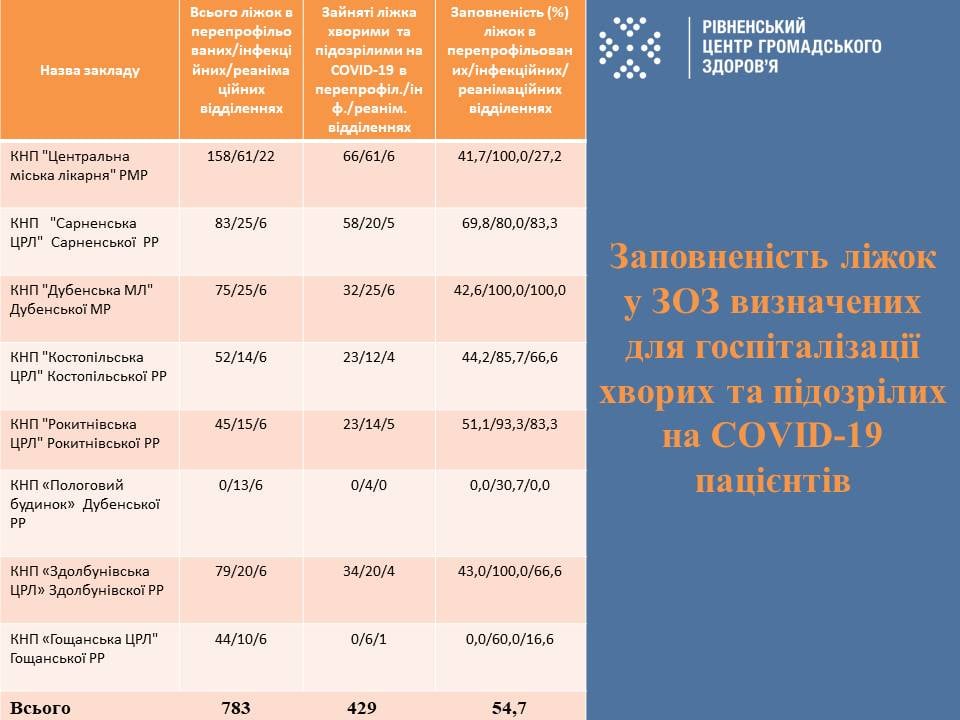На сторінці Рівненського обласного центру громадського здоров’я опублікували дані про заповненість ліжкового фонду у 8-ми медзакладах першої хвилі.