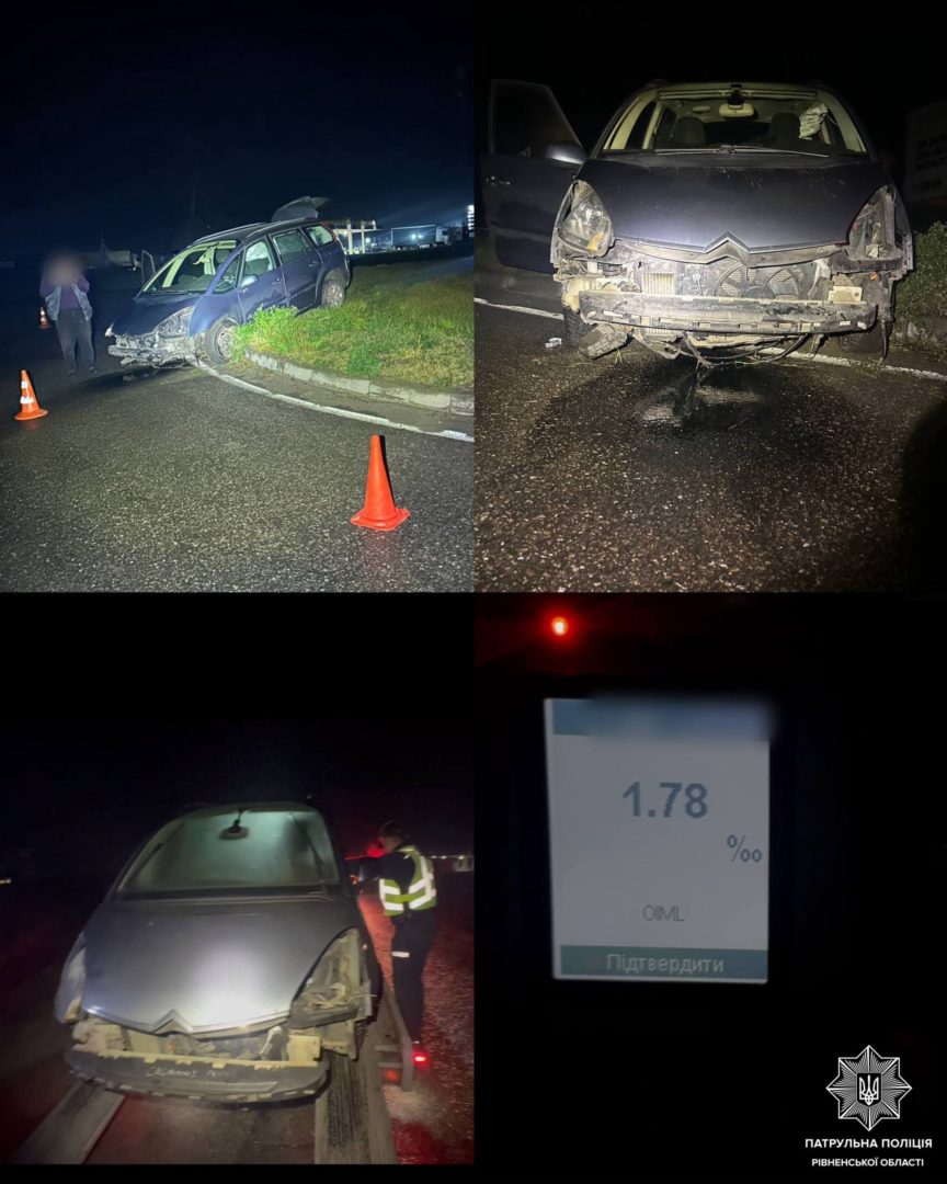 Перша аварія сталася поблизу села Великий Житин. Водій автомобіля Citroen Picasso не впорався з керуванням і наїхав на бордюр під час руху кільцем. Перевірка на стан сп’яніння показала 1,78 проміле алкоголю.