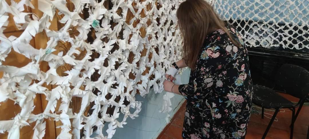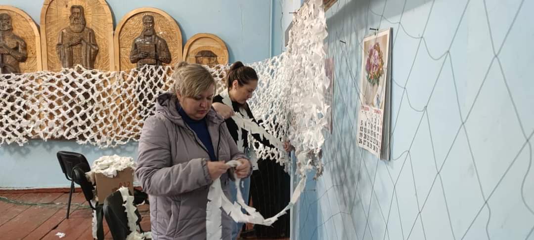 В Острозі в Будинку культури на 2 поверсі щодня плетуть маскувальні сітки для військових.