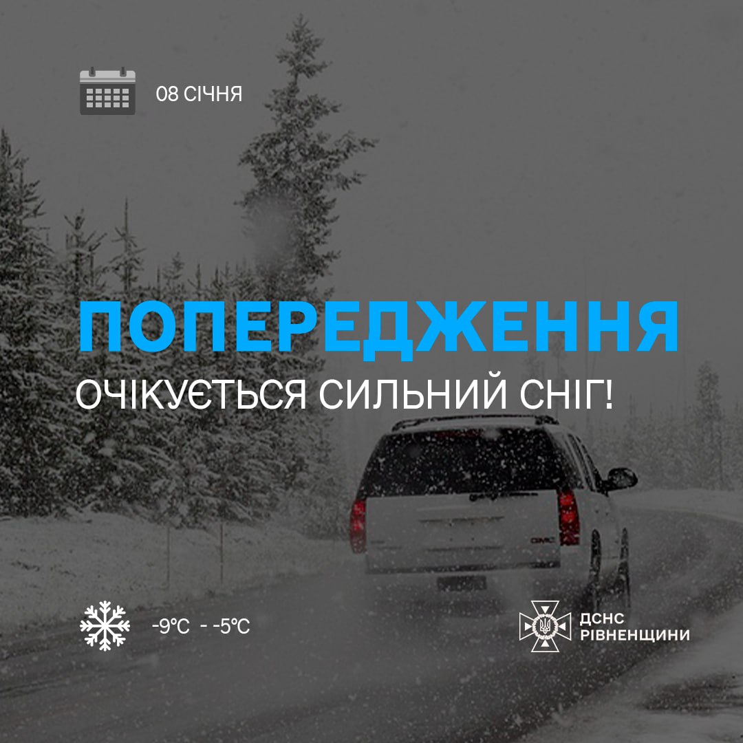 За інформацією Рівненського обласного центру з гідрометеорології, у середу, 8 січня, у Рівному та по всій області прогнозують сильний сніг.