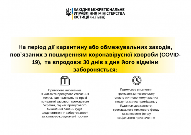 Також, на час дії карантину та продовж 30 днів з дня його скасування працівникам органів державної виконавчої служби заборонено буде виконувати рішення щодо примусового виселення громадян за несвоєчасну оплату житлово-комунальних послуг із жилих приміщень у будинках державного, громадського житлового фонду та житлового фонду соціального призначення. Наголошуємо, що стягнення житла може відбуватися тільки за рішенням суду.