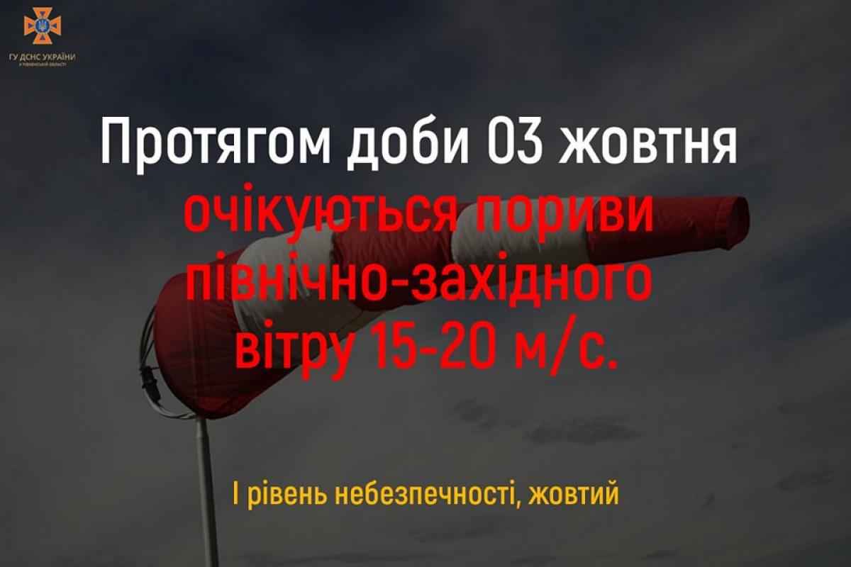 За інформацією Рівненського обласного гідрометеоцентру впродовж 3 жовтня на території Рівненщини очікуються пориви північно-західного вітру силою 15-20 м/с.(І рівень небезпечності, жовтий).