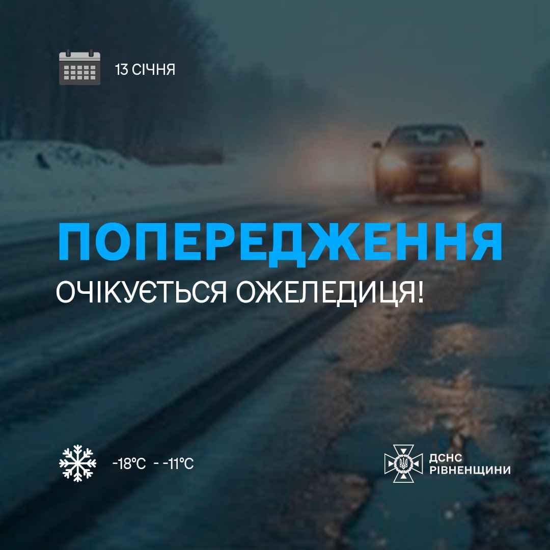 У вівторок, 13 січня, у Рівному та на території області прогнозують ожеледицю на автошляхах.