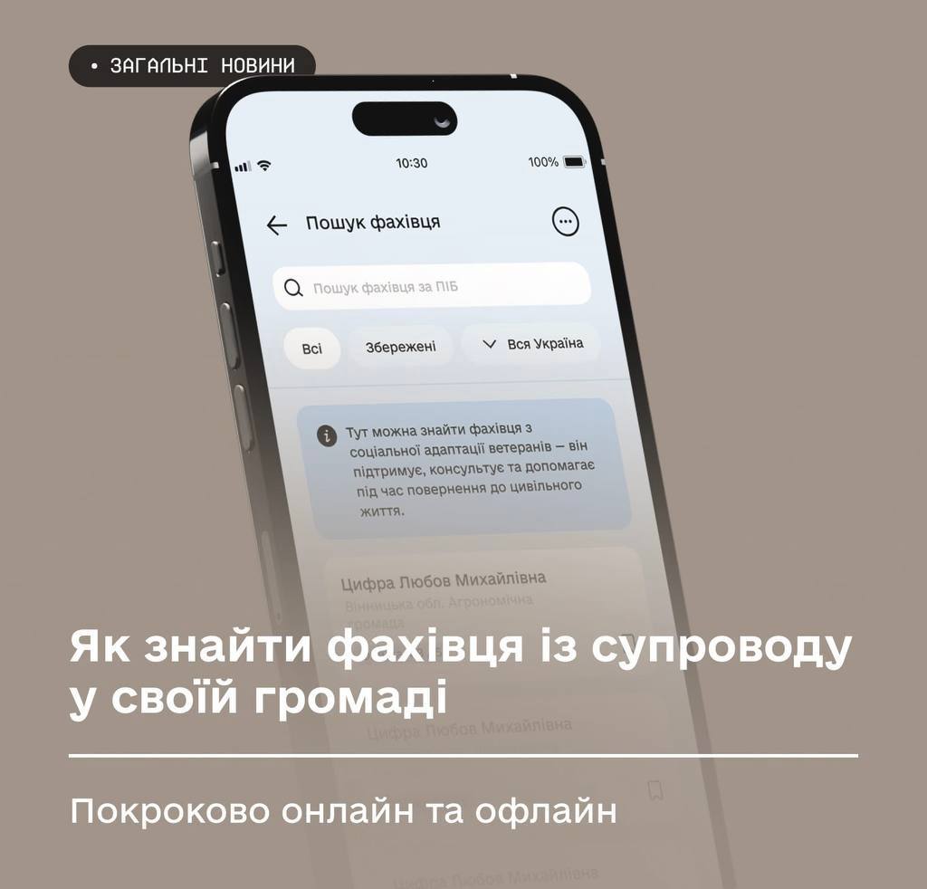 У розділі «Сервіси» → «Ветеран Pro» → «Пошук фахівця» можна знайти спеціаліста, який працює у вашій громаді, та отримати контактні дані.