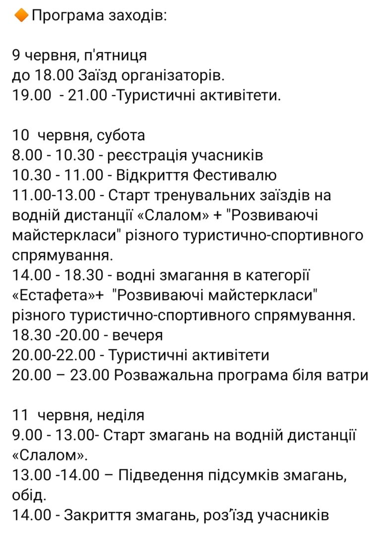 Учасники та гості « Фестивалю» матимуть змогу активно відпочити, взявши участь у вільних активітетах: тематичних майстер класах з різних видів туризму, навчальних заняттях з надання Першої домедичної допомоги та повпралятися в греблі на катамаранах та байдарках.