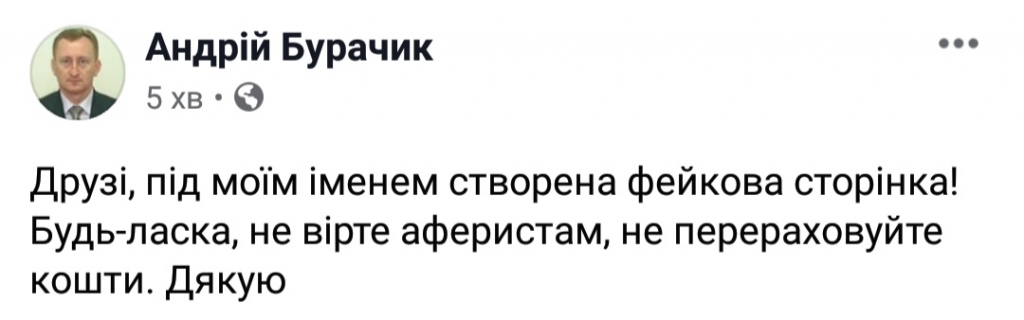 Друзі, під моїм іменем створена фейкова сторінка! Будь-ласка, не вірте аферистам, не перераховуйте кошти. Дякую, – написав Бурачик.