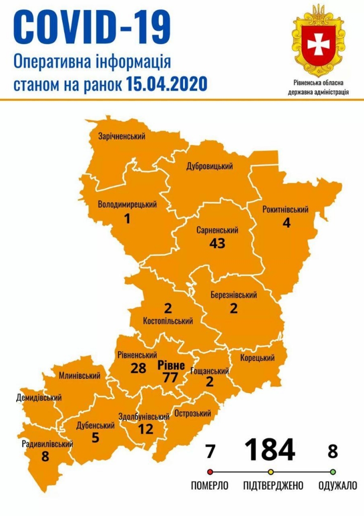Таким чином в Рівненській області наразі маємо 184 випадки захворювання на коронавірус, 7 летальних, 8 людей одужало.