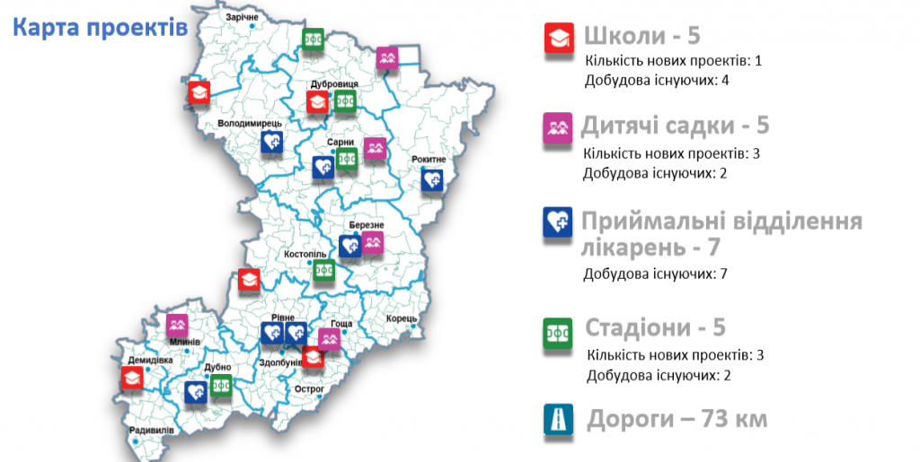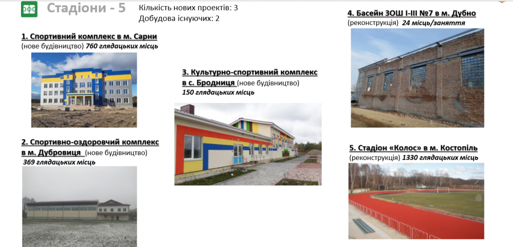 Передбачена програмою «Велике будівництво» і розбудова об’єктів спортивної інфраструктури. Це будівництво спорткомплексу в Сарнах на 760 місць, спортивно-оздоровчого комплексу у Дубровиці на 369 місць та культурно-спортивного закладу в селі Бродниця Зарічненського району на 150 місць. Окрім цього, планується реконструкція басейну в Дубно та стадіону «Колос» в Костополі на 1330 місць. Загальна вартість п’яти об’єктів становить 160 мільйонів гривень.