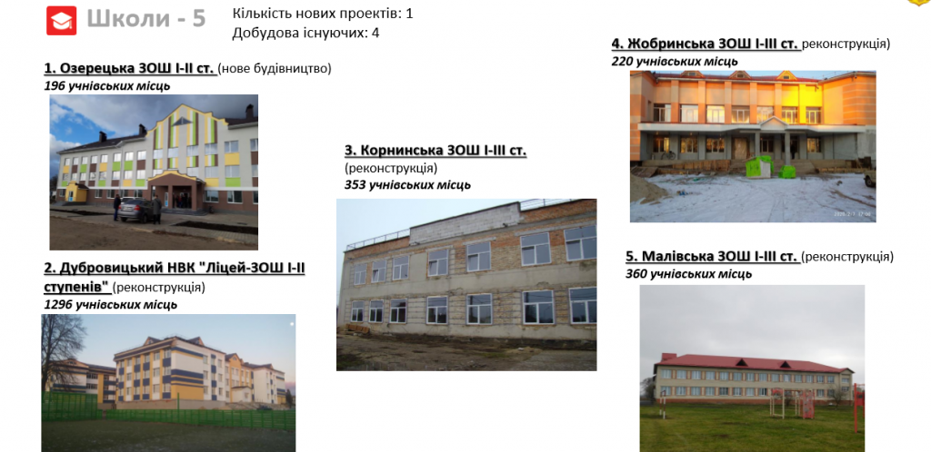 Так, на Рівненщині кошти спрямують на будівництво Озерецької школи, що у Володимирецькому районі. Реконструюють Дубровицький НВК, Малівську школу Демидівського району, Корнинський та Жобринський закладиРівненського району. Вартість 5-ти проєктів – 241,1 млн грн, а загальна кількість учнівських місць – 2425.