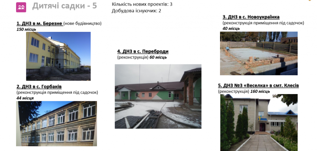 Щодо дитячих садків, то будівництво передбачається в Березному, а реконструкція – в селах Горбаків Гощанського, Новоукраїнка Млинівського, Переброди Дубровицького районів та у смт Клесів, що на Сарненщині. Вартість 5-ти проєктів становить 131 мільйон гривень, а загальна кількість дитячих місць – 454.
