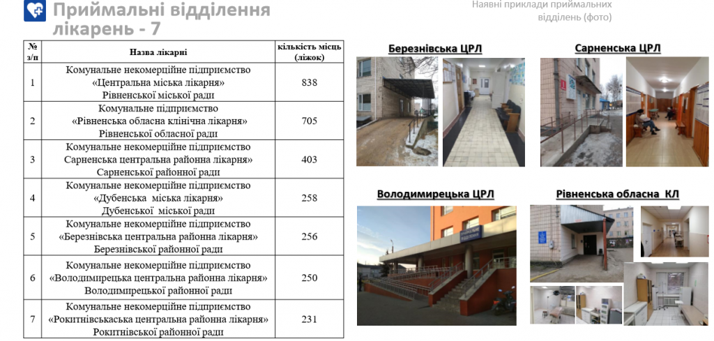 Так, для Рівненської області затверджено реконструкцію та укомплектування 7-ми приймальних відділень опорних лікарень.