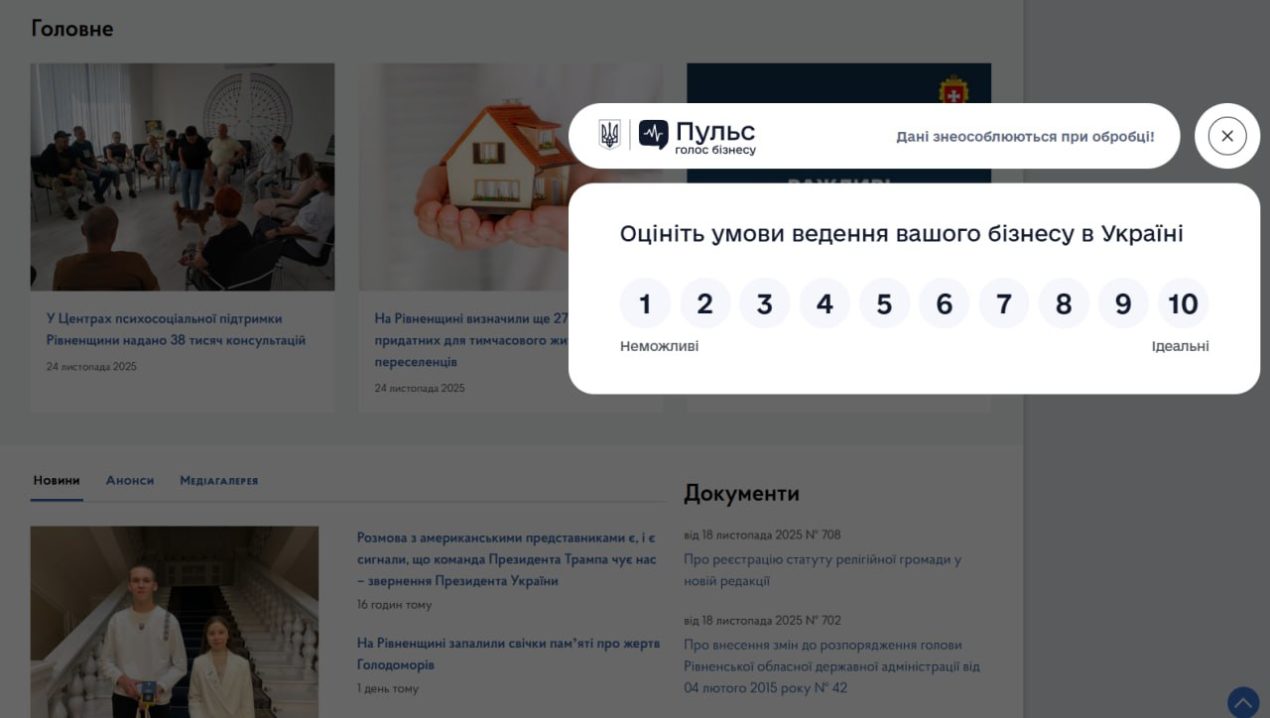 На Рівненщині зробили ще один крок для покращення комунікації підприємців із державною владою. На офіційному сайті Рівненської ОДА запрацював віджет платформи «Пульс», який спрощує взаємодію бізнесу з органами виконавчої влади.