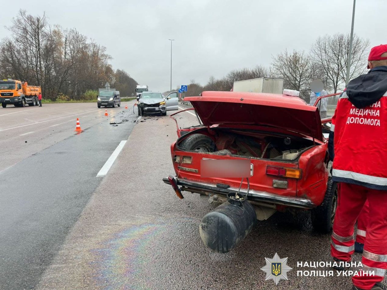 За попередніми даними, 72-річний водій автомобіля «ВАЗ», житель села Балашівка, намагався виконати розворот, але не переконався у безпечності маневру. У цей момент у нього на швидкості врізався позашляховик «Volkswagen Touareg», яким керувала 31-річна мешканка Києва.