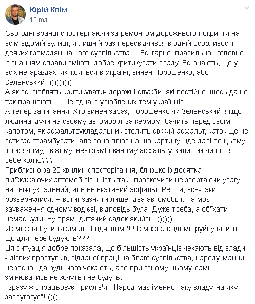 Згідно з його твердженням, дехто з автомобілістів, незважаючи на укладання асфальту, проїжджав по ще не закінченій дорозі, чим наносив їй пошкодження. Автор посту також розповів про те, що робив зауваження декотрим водіям. Ті, в свою чергу, пояснювали свій учинок тим, що дуже поспішають, а об’їзду немає.