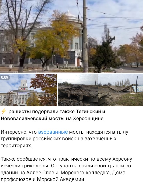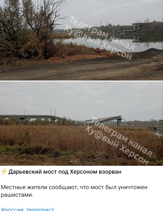Як пишуть місцеві ЗМІ та ТГ-канали з посиланням на мешканців, підірвані Даріївський, Тягінський та Нововасилівський мости в тилу окупантів.