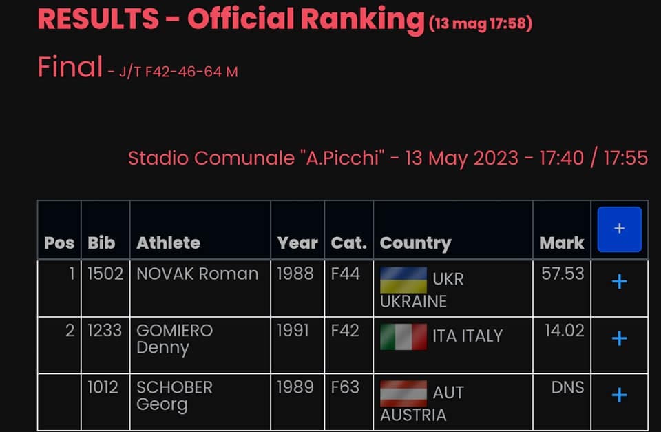 У складі збірної команди України у змаганнях брав участь майстер спорту України міжнародного класу з легкої атлетики, вихованець Рівненської обласної дитячо-юнацької спортивної школи осіб з інвалідністю Роман Новак, який здобув золоту нагороду у метанні спису з результатом 57.53 метри.