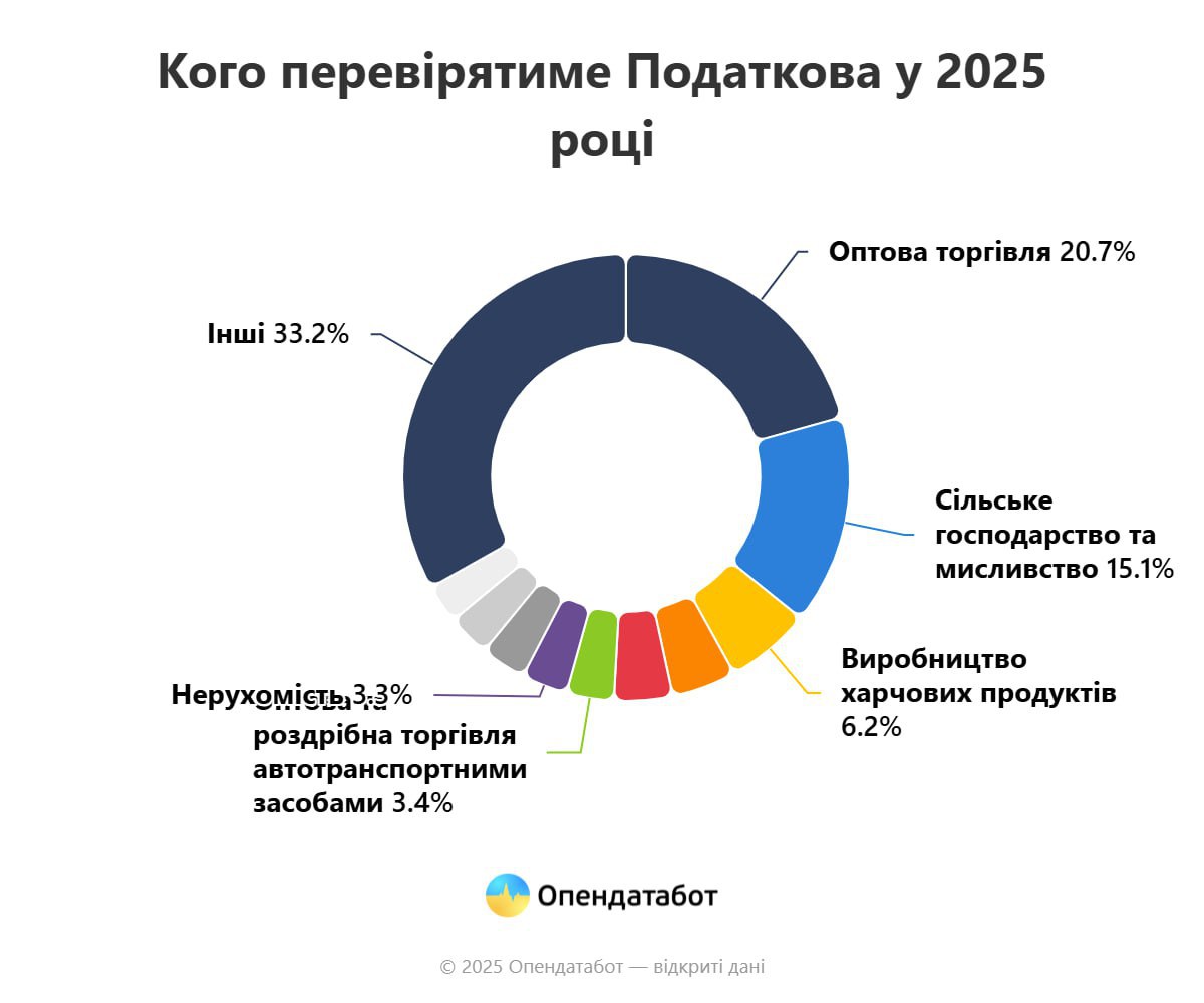 Аналіз сфер діяльності, які потраплять під пильне око податкової, показує, що найбільше перевірок очікують компанії, що працюють у сфері оптової торгівлі (20,7%). Значна кількість перевірок також припаде на сільське господарство та мисливство (15,1%), а також на виробництво харчових продуктів (6,2%).