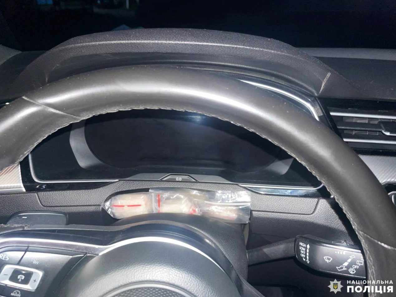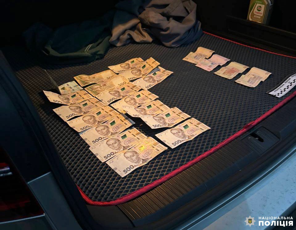 Під час обшуку автомобіля затриманого поліцейські вилучили значну суму грошей, ймовірно, виручену від продажу наркотиків, а також багато згортків з метамфетаміном.