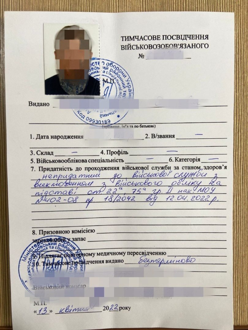 Прокурорами Рівненської обласної прокуратури до суду скеровано обвинувальний акт стосовно двох жителів Волині, які роздруковували бланки тимчасового посвідчення військовозобов’язаного, вклеювати до них фото осіб призовного віку та вносити записи про те, що осіб визнано непридатними до військової служби зі зняттям з військового обліку. Клієнтів ділки шукали через Telegram-канали.