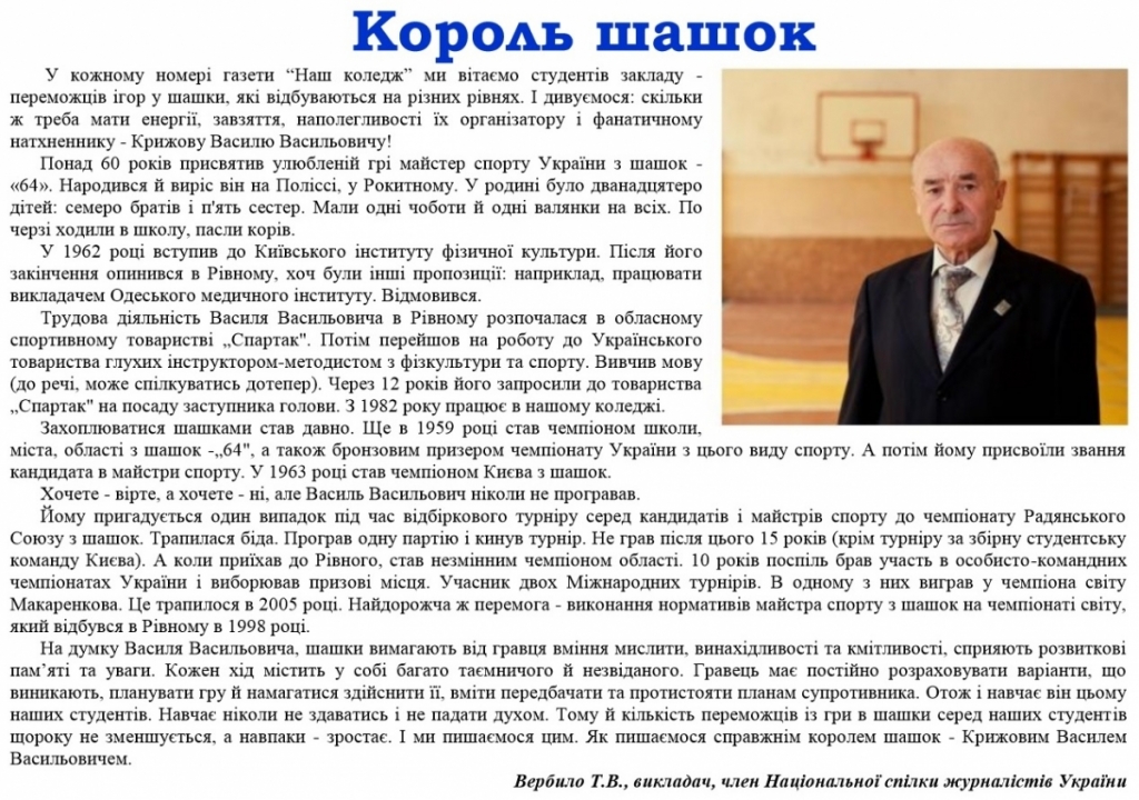 Легендарний Василь Васильович Крижов – викладач Коледжу економіки та бізнесу та майстер спорту СРСР з шашок – помер раптово (після трьох виграних партій і під час четвертої).
