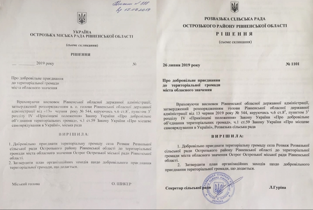 В списку аутсайдерів тоді також були Здолбунівський та Корецький райони. Та 26 липня Острозька міська рада, спираючись на рішення Розвазької сільради, прийняла своє рішення про добровільне об’єднання. Місто обласного значення та сусідній Розваж утворили першу в районі Острозьку ОТГ. Щоправда, створення громади відбулося без виборів. Заступником міського голови Олександра Шикера депутати обрали Юрія Ягодку – очільника Розвазької сільської ради. Тепер перед Острозькою ОТГ відкриваються нові перспективи розвитку.
