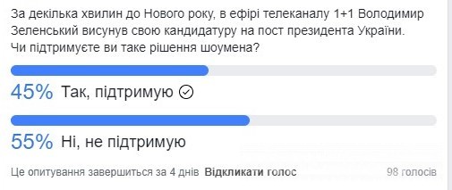 Також голосування проводилося на нашій публічній сторінці на якій проголосувало 98 людей, з яких 45% підтримують шоумена, а 55% не підтримують