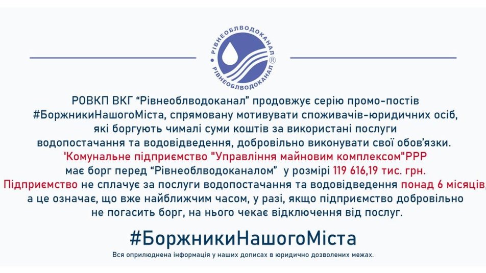 Напередодні на офіційній сторінці «Рівнеоблводоканалу» опублікували чергову інформацію про боржників. Там вказано, що управління майновим комплексом Рівненської райради боргує 119 тисяч і не сплачує понад пів року.