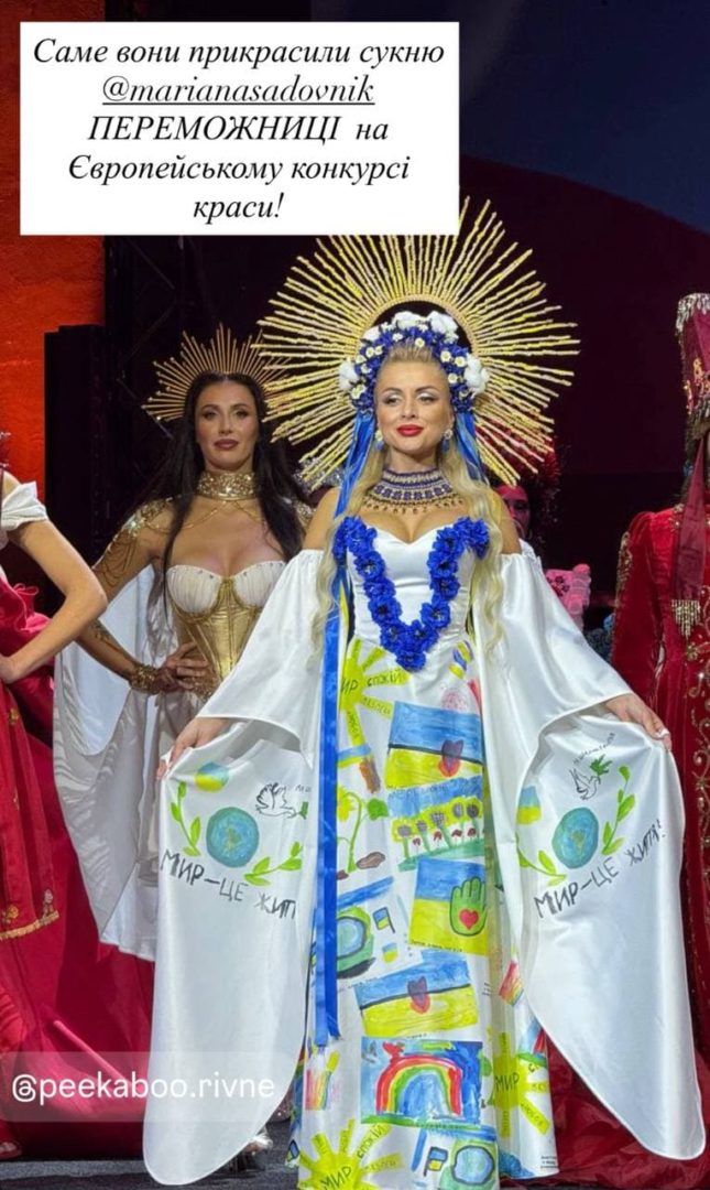 На сцені вона презентувала унікальний національний костюм — білу сукню, розписану дитячими малюнками вихованців рівненського садочка. На рукавах — напис «Мир — це життя», який символізує головний посил її виступу.