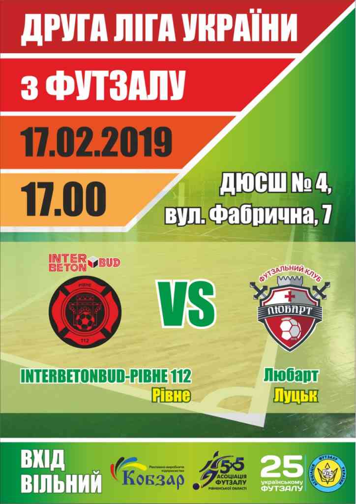 Сьогодні, 17 лютого, о 17:00 годині, у ДЮСШ №4, що на вулиці Фабрична 7, відбудеться матч INTERBETONBUD-РІВНЕ 112 (Рівне) проти ЛЮБАРТ (Луцьк). Вхід вільний.
