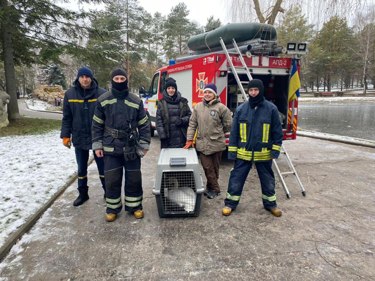 Працівники зоопарку чергували два дні навколо озера, а сьогодні силами та спецзасобами Головного управління ДСНС у Рівненській області, білого красеня дістали з озера і передали в Рівненський зоопарк.